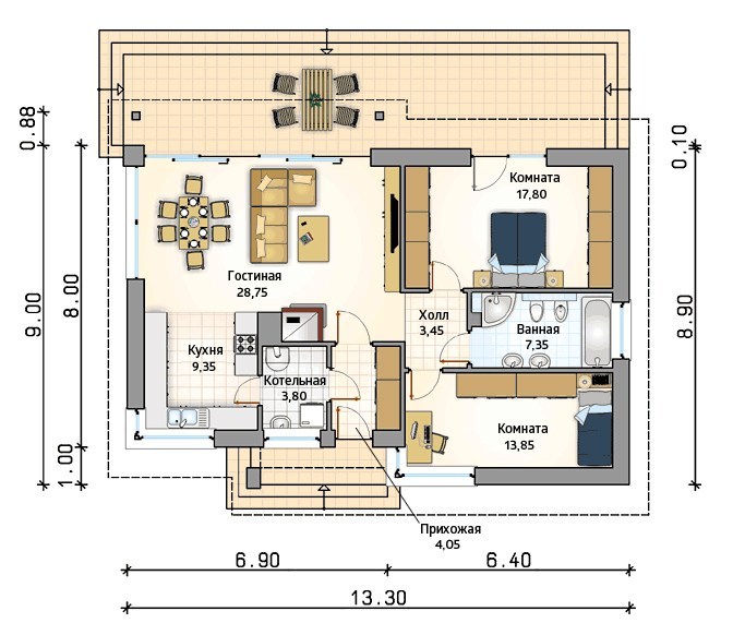Общая площадь — 88.4 м2 | Площадь застройки — 121.80 м2
