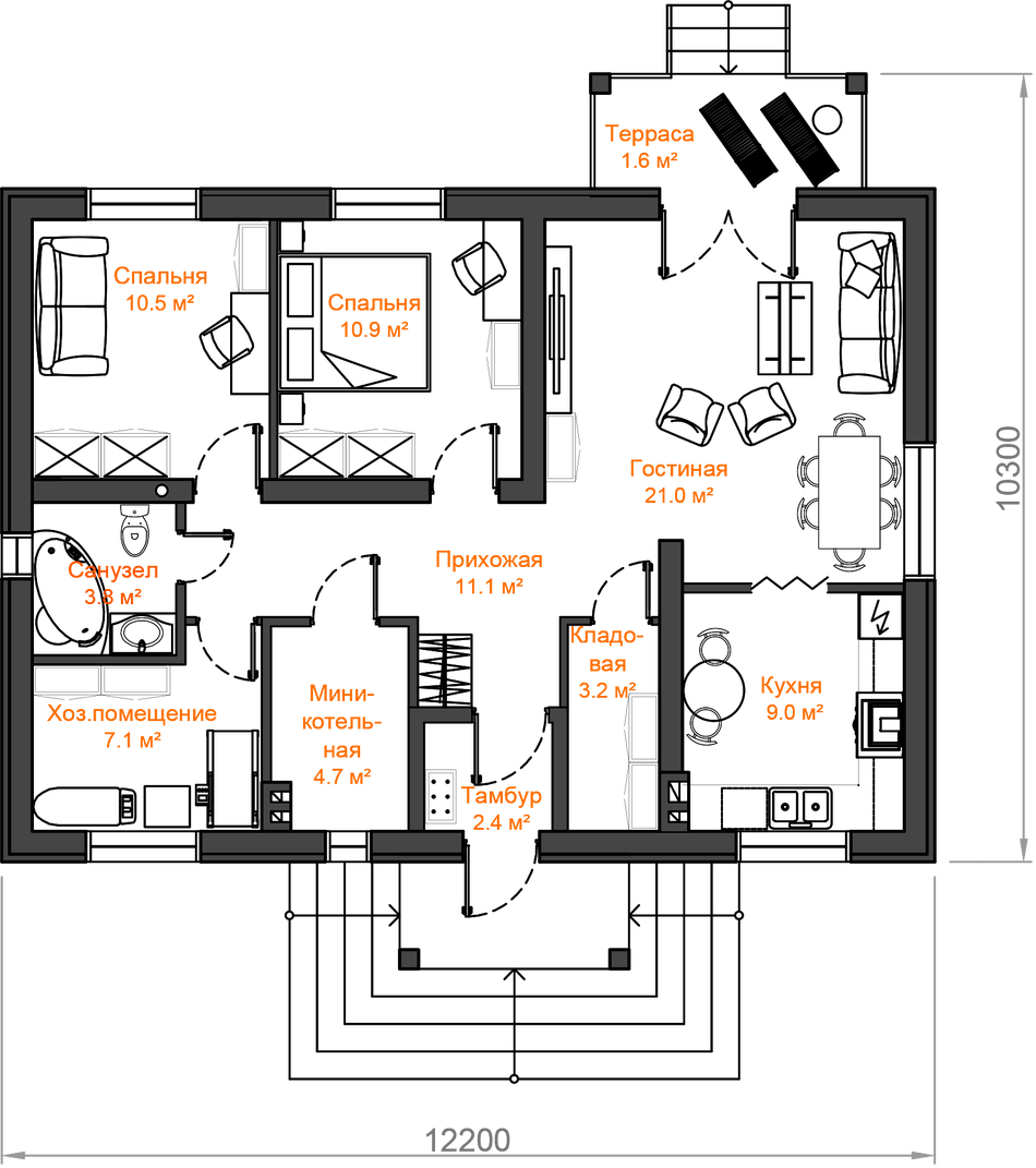 Габариты — 10.30×14.7 м | Этаж — 1